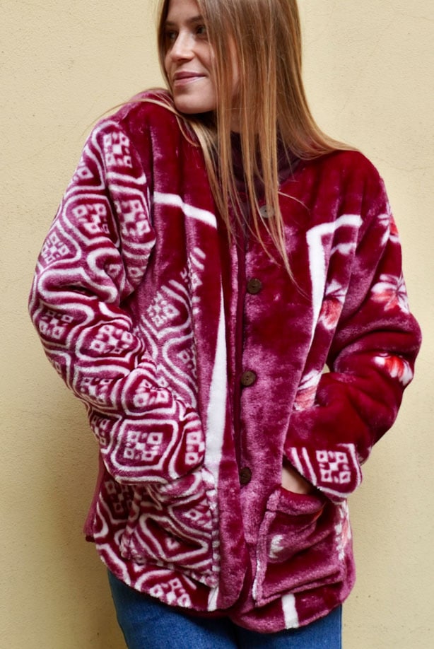 - Abbiamo trovato queste coperte in un negozio nell’ultimo viaggio in India e abbiamo provato a creare qualcosa adatto alle temperature più fredde e credo che ci siamo riusciti perché tengono veramente caldo. Sono una coccola!