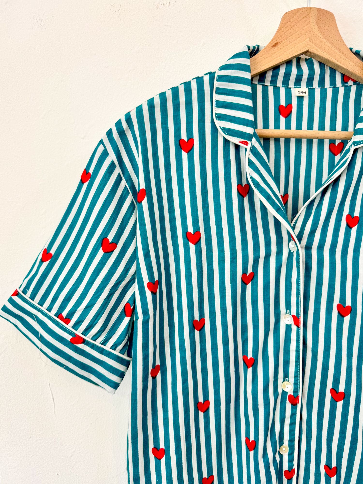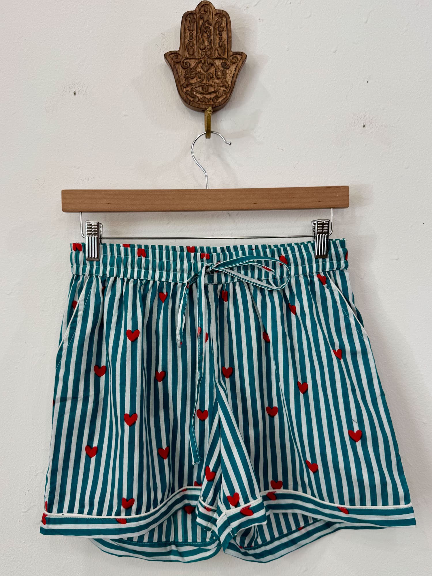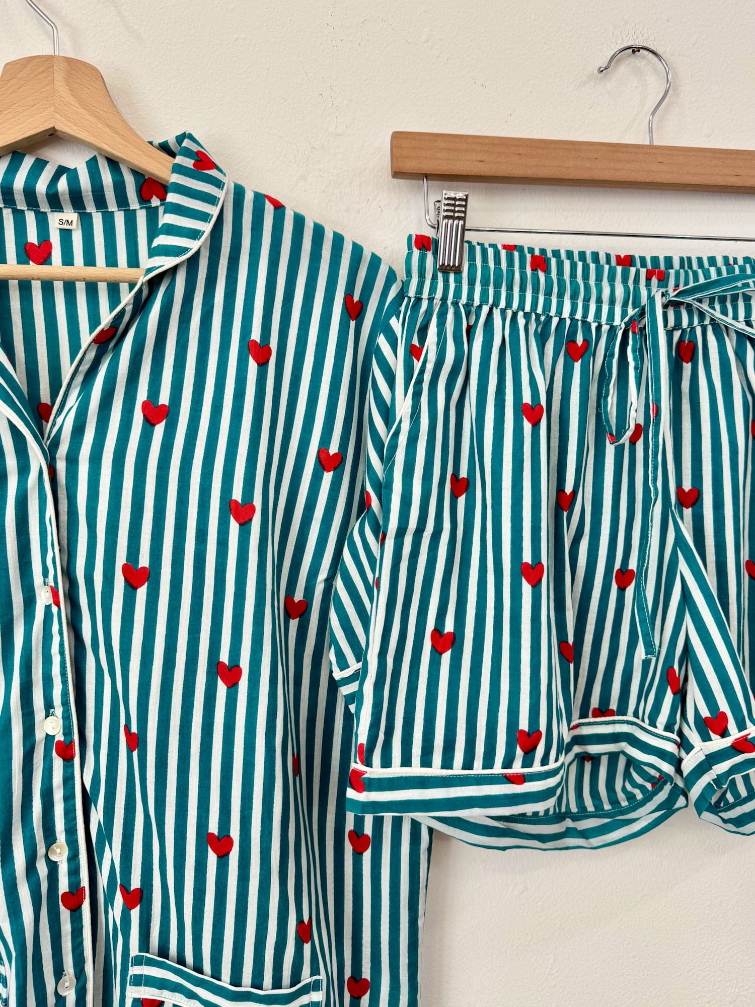 Short Pajamas Set ~ Teal Stripes & Hearts