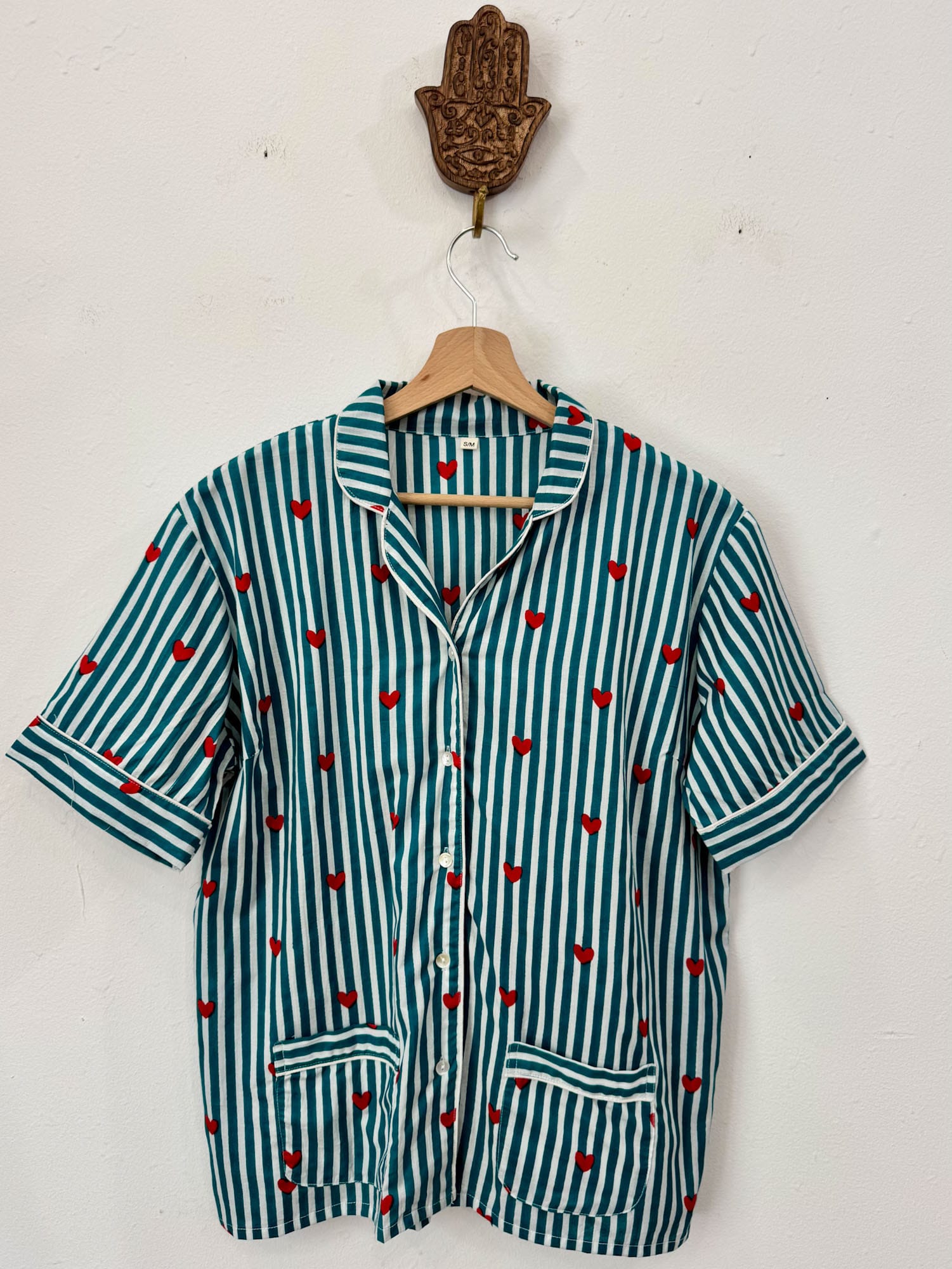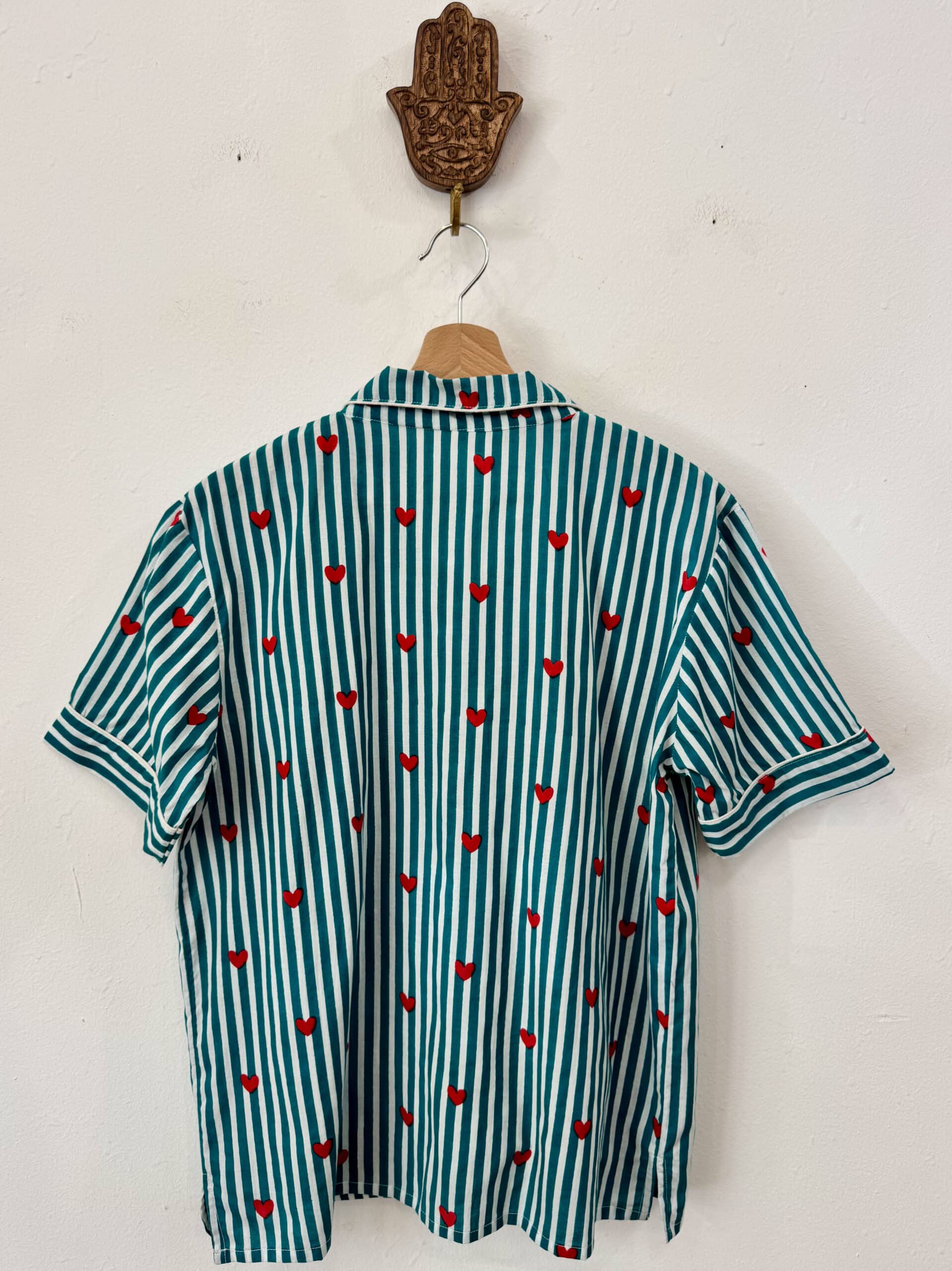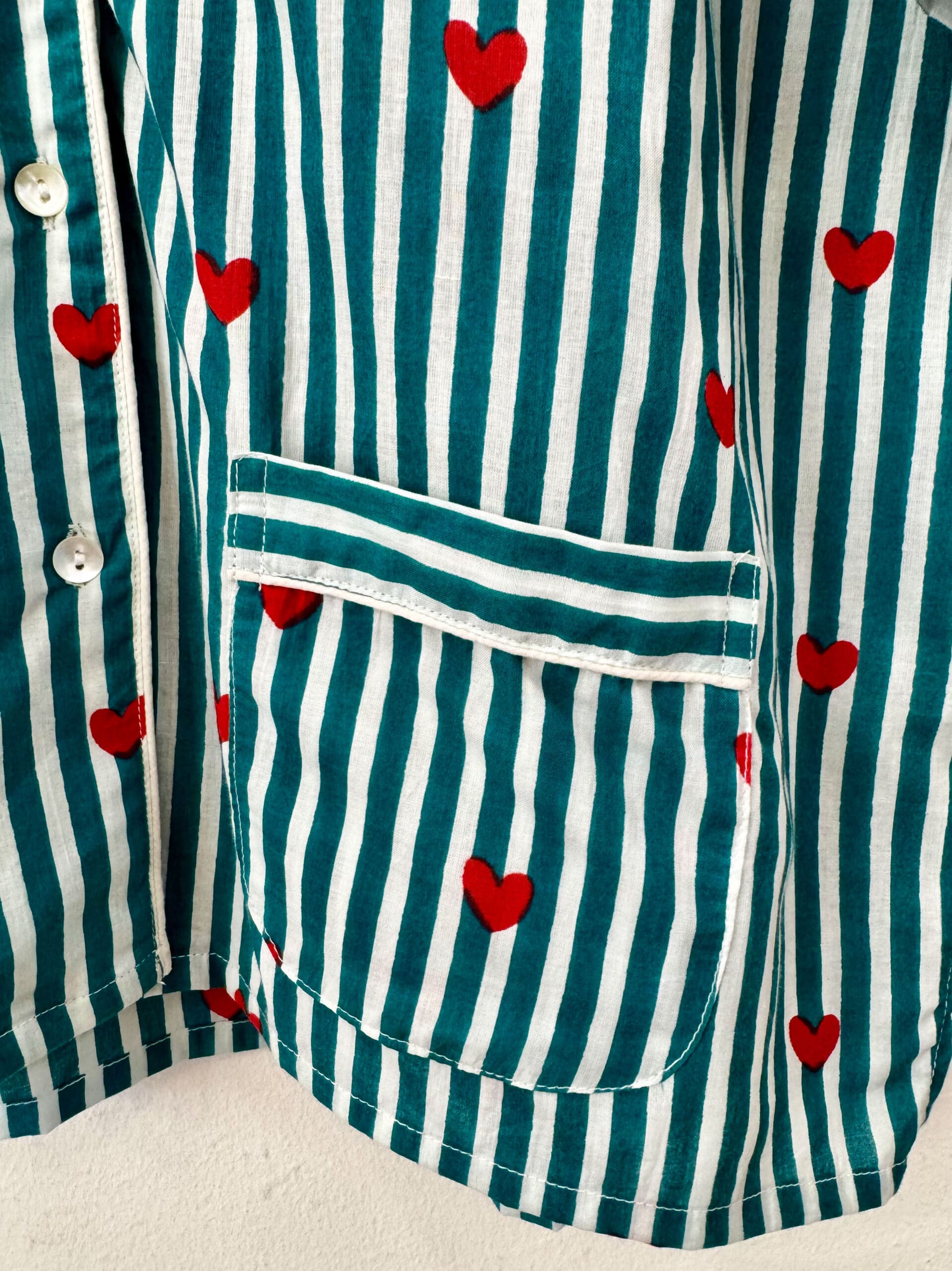 Short Pajamas Set ~ Teal Stripes & Hearts